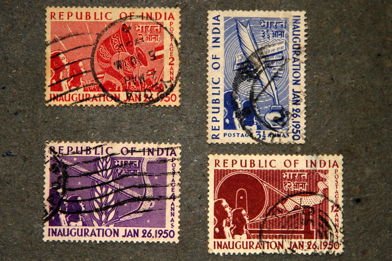 1950 is a landmark year for India. This is the year, when India adopted its constitution and what a constitution it has been. It has been very successful in keeping a diverse nation united and managed to prove all pessimistic pundits wrong. In commemoration of the coming in-force of the constitution, 4 stamps were released. These were the only commemorative stamps that were released that year.